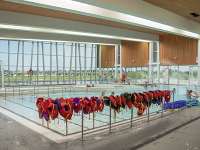 Only puddle jumpers and PFD's approved by the US Coast Guard or the Canadian Ministry of Transportation are permitted in the ATRC - WFCU Community Pools. Lakeshore Recreation has PFD's on site and available, at no charge, during all drop-in swims.