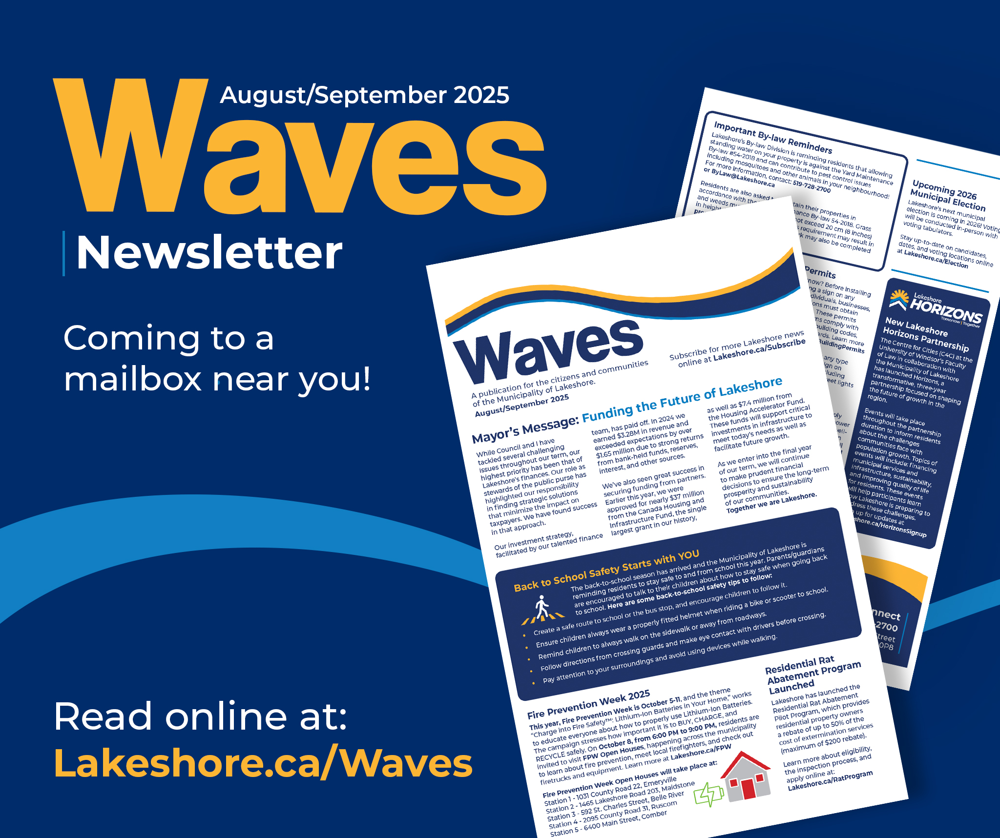 The Lakeshore Waves newsletter is regularly delivered to residents in the Municipality of Lakeshore via water and property tax bills.