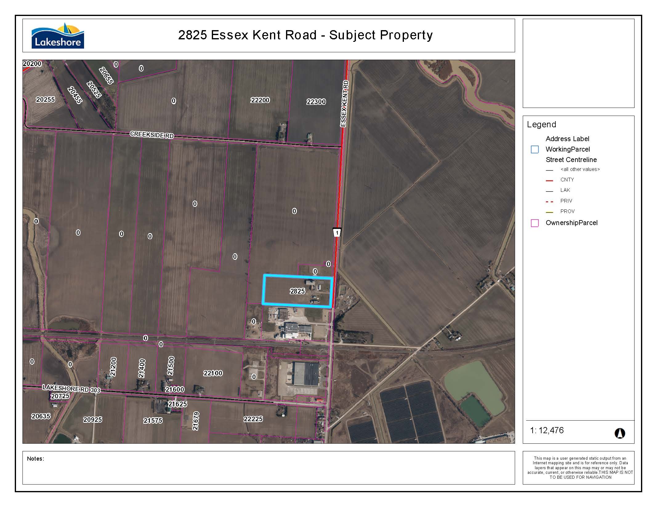 Subject Property: 2825 Essex Kent Road (Legal description: Part of Lot 22, Concession 2, Tilbury, designated as Part 1 on 12R5575 and Parts 1-11 on 12R4334, subject to R426352 and TN9054; Lakeshore, subject to an easement in gross over Part 9 on 12R29203 as in CE1122746)