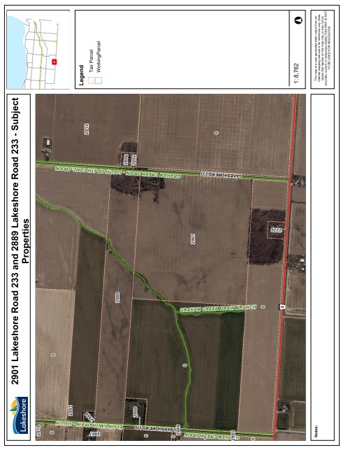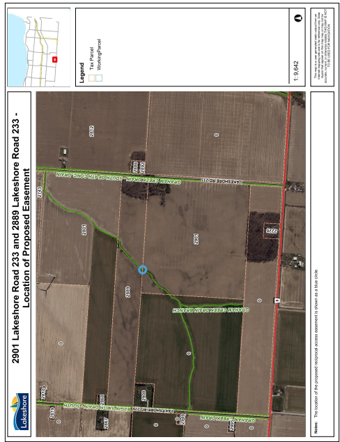 Purpose of Application: The purpose of the application is to establish a reciprocal access easement for farming purposes between the landowner of 2901 Lakeshore Road 233 and the landowner of 2889 Lakeshore Road 233.