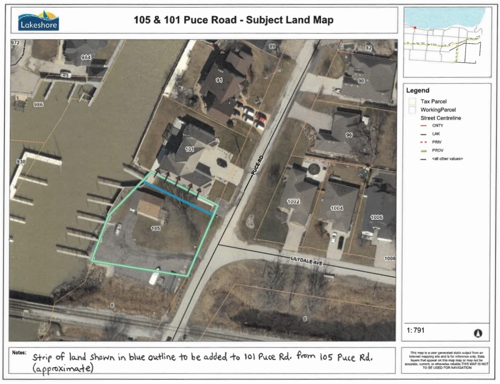 Purpose of Application: The Municipality of Lakeshore has received an application to sever approximately 163.5 m2 (1,760 ft2) of land from 105 Puce Road to be added to 101 Puce Road.