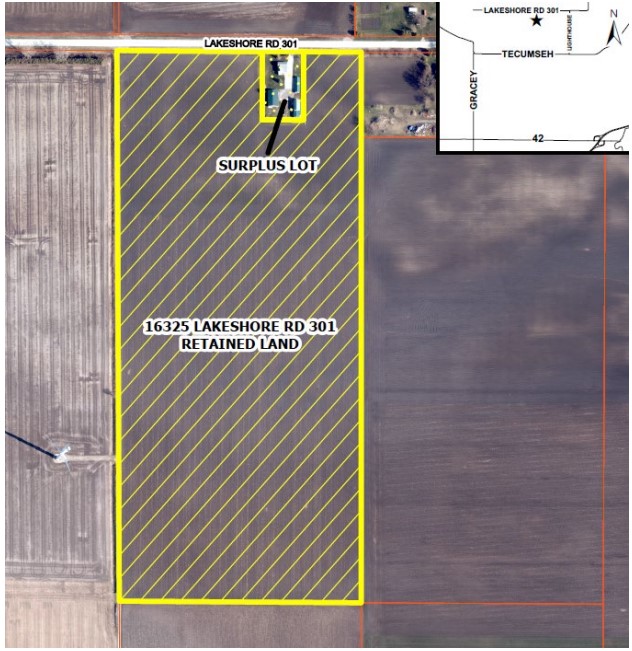 A sketch detailing the retained farmland parcel (labelled as “16325 Lakeshore Rd 301 Retained Land” on the sketch) to be rezoned is attached to this notice.