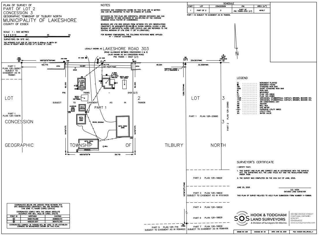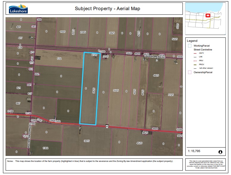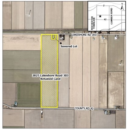 Purpose: A land severance (file: B-05-2025) was granted from the Lakeshore Committee of Adjustment to sever two existing dwellings and accessory structures from the Subject Property as a separate residential lot. The dwellings are considered surplus to a farming operation.