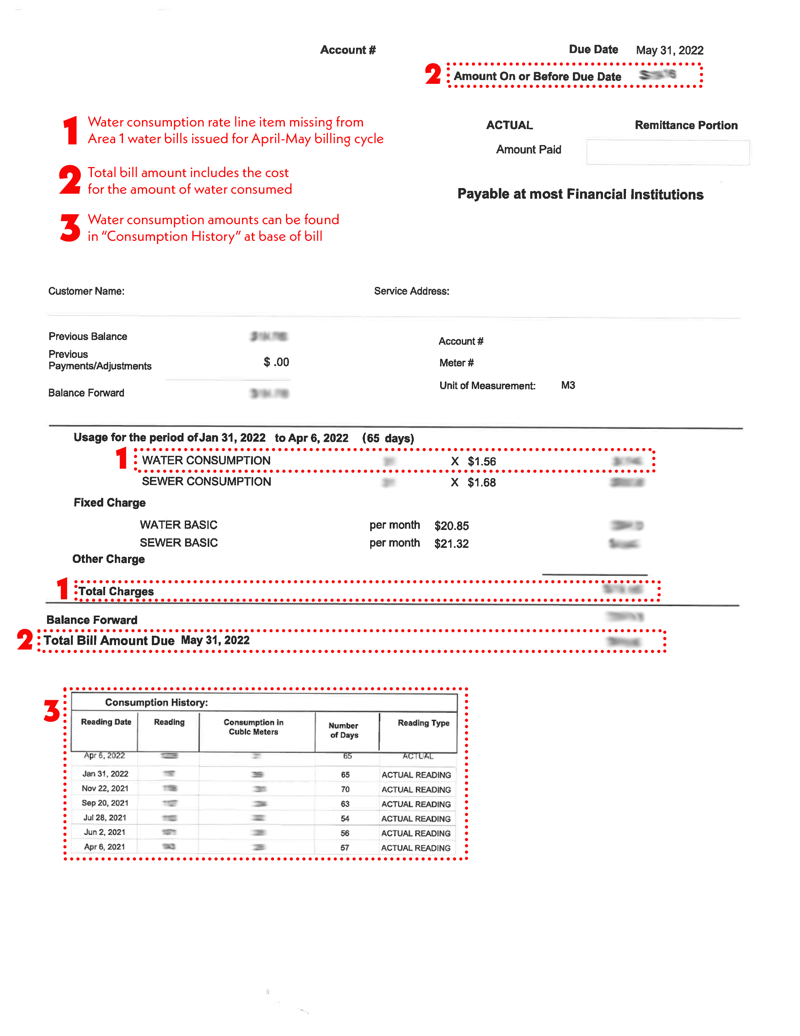 Please note that water consumption information in the recently distributed water bills for Area 1 (East Belle River & East of Rochester Townline) did not appear in the usage section of the bill.